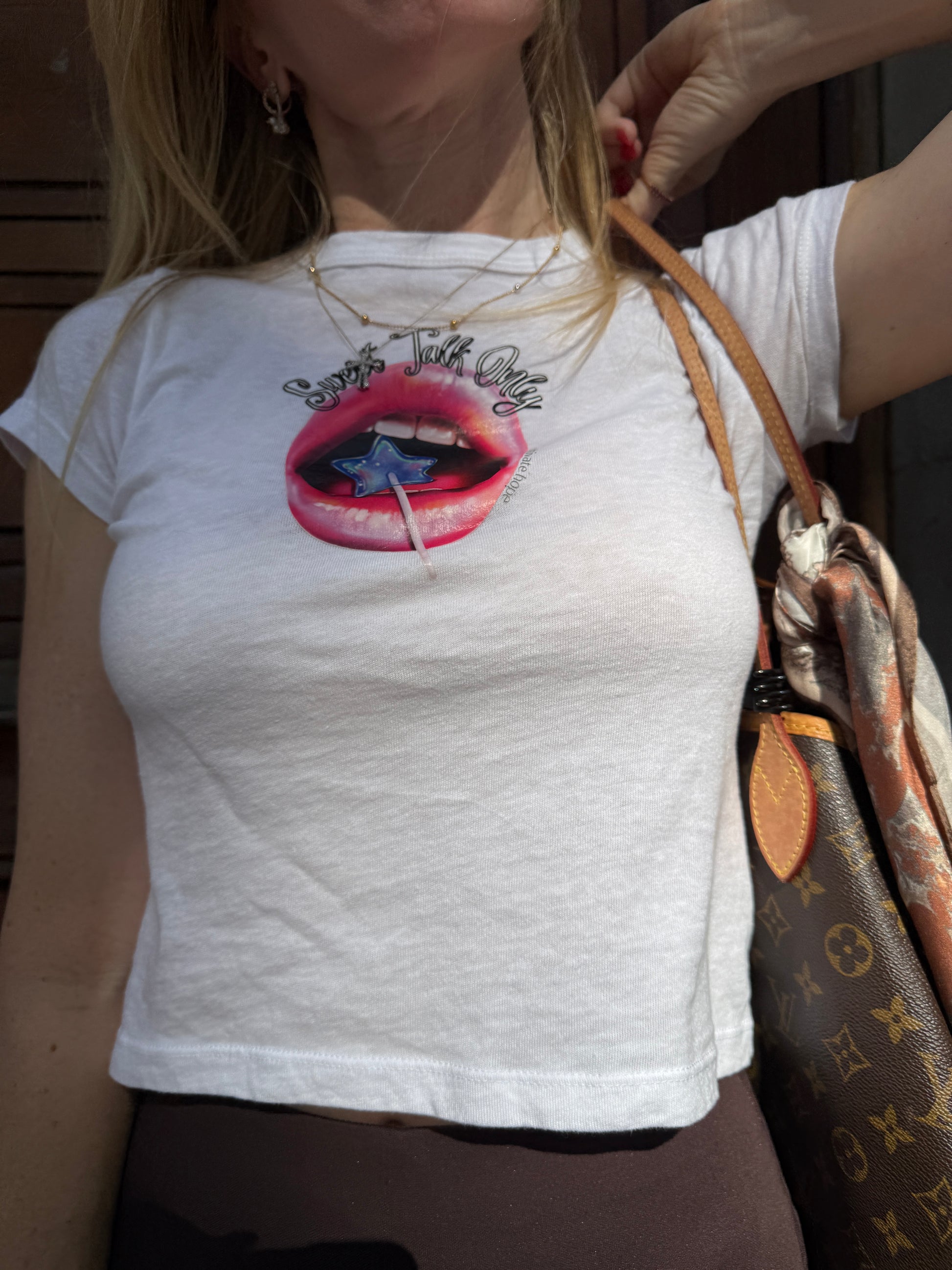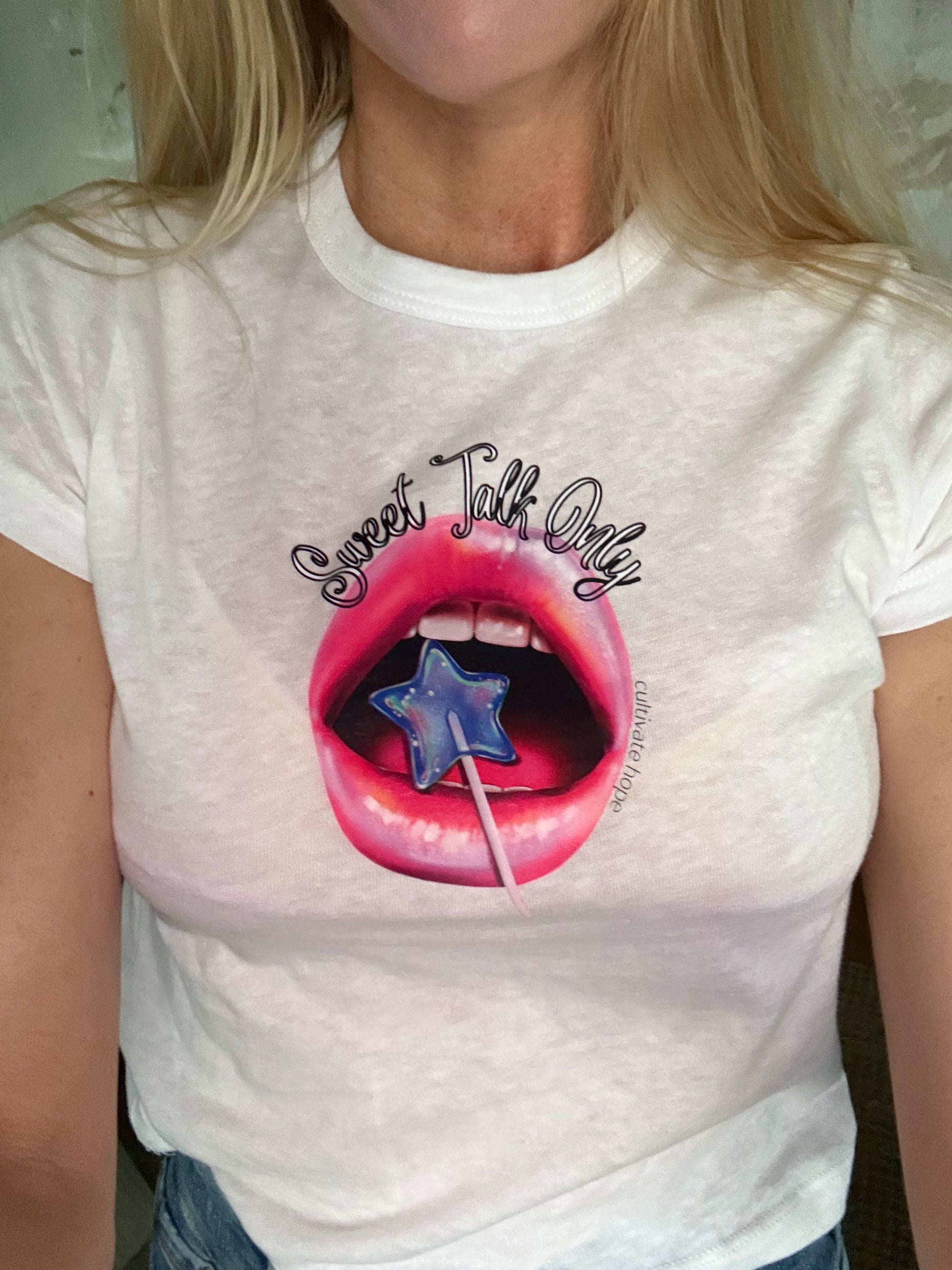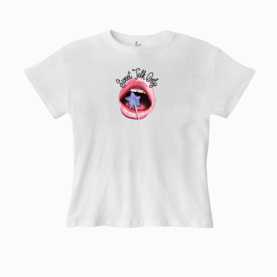 The Sweet Talk Only Tee is made using a semi sheer 100% airy slub cotton that gets softer and better with every wear. This style features a vintage inspired lips graphic, nostalgic star lollipop, and curly cue typeface across the chest, with ELPIS signature details.