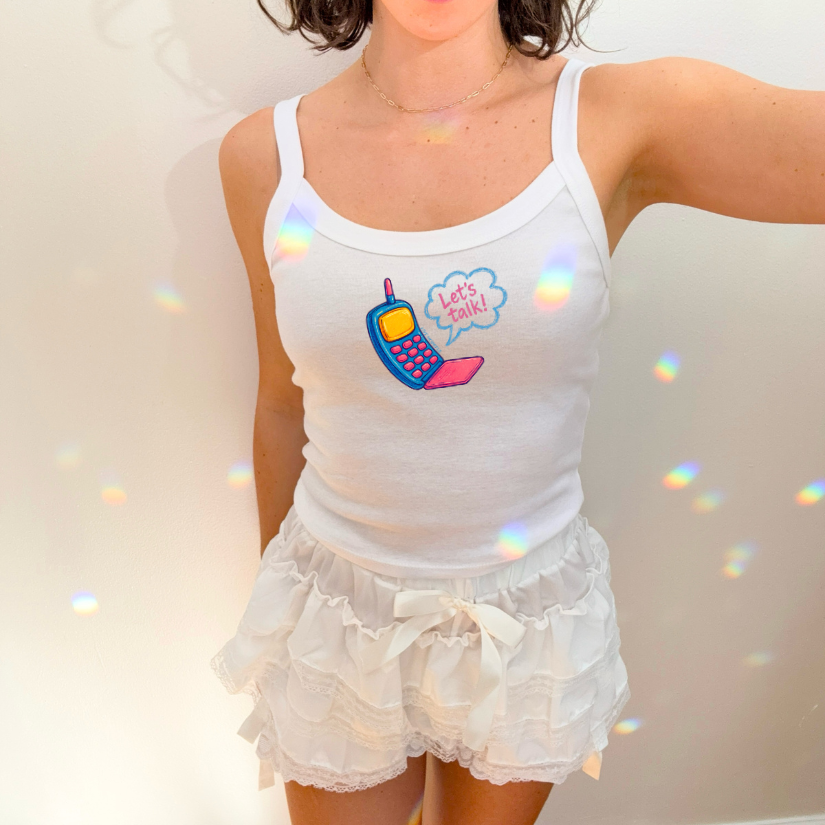 Meet the Spaghetti Crop, your new layering essential. This baby tee–meets–crop, hits just right with its delicate spaghetti straps and easy fit. It's soft, airy, and endlessly wearable—whether you’re pairing it with low-rise denim, layered under a blazer, or letting it shine on its own. Like all of our pieces, the Spaghetti Crop is designed to feel equal parts playful and elevated, with a touch of that nostalgic ‘90s energy we love bringing back to life.