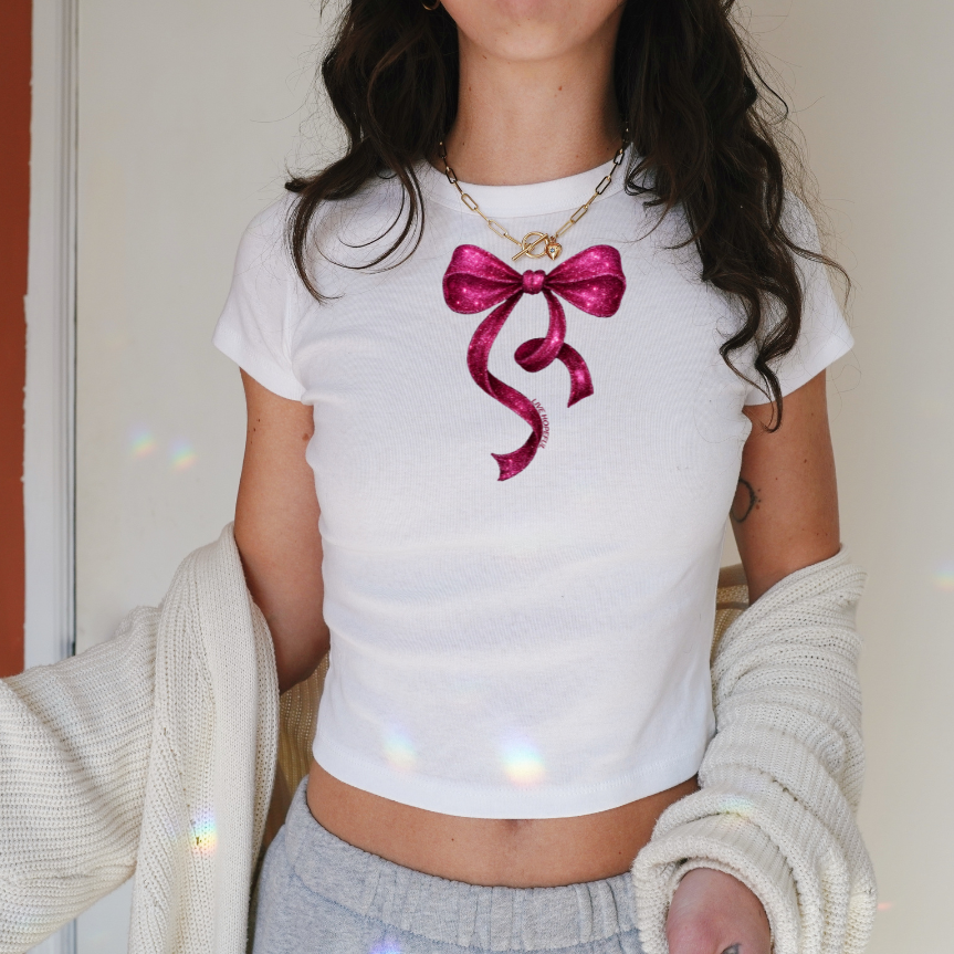 The Pretty Pink Bow Tee is made from a super soft ring-spun heirloom combed cotton-poly blend that gives it a lived in feel from the start. This style features a  shimmery loopy bow across the chest, with ELPIS signature details.
